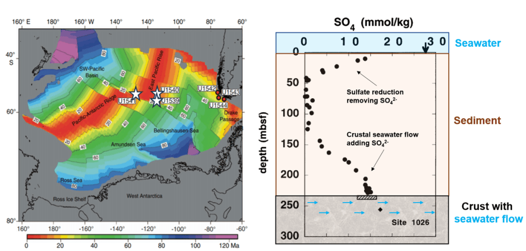 Locations of IODP study sites U1539, U1540, and U1541 (marked in white stars), and example of a gradient reversal in pore water sulfate from the Juan de Fuca Ridge. The arrow on the x-axis indicates seawater sulfate concentration, and the rectangle with hashing indicates the sediment-crust interface. Modified from Elderfield et al., 1999.