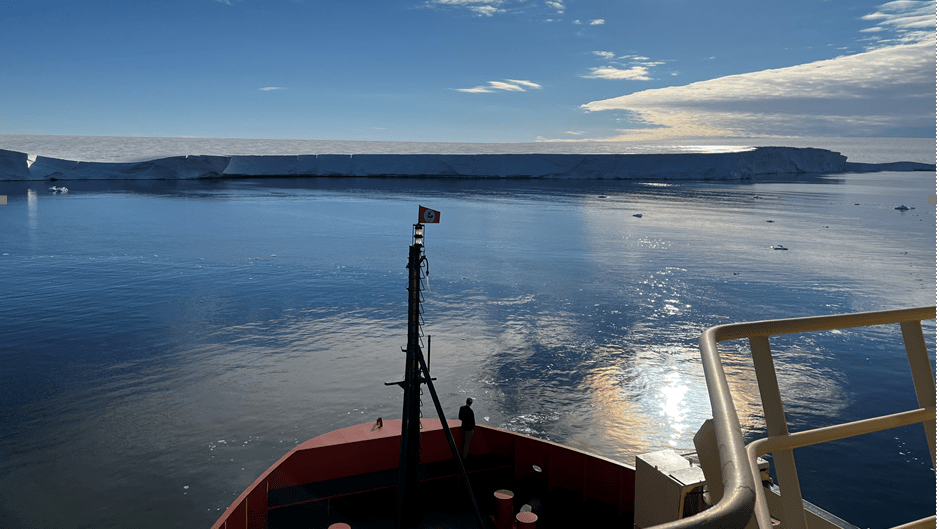 Photos from the 2022 cruise to the Amundsen Sea on the RV Nathaniel B. Palmer. Left: Retrieval of a sediment core on deck. Right: View of the Dotson Ice Shelf from the bridge.